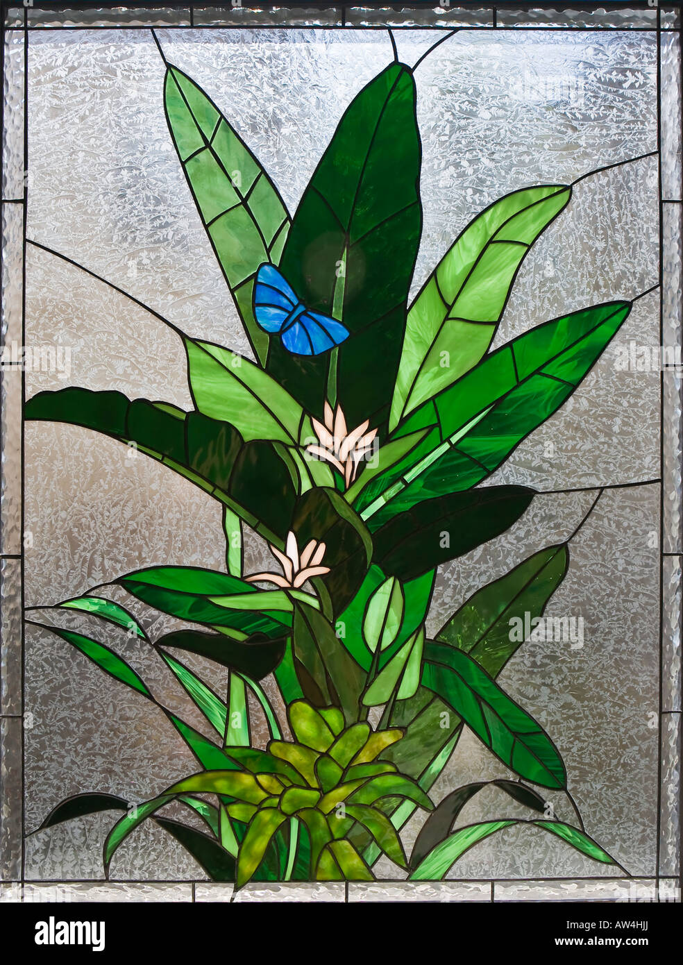 Stained Glass Window Of Green Plant And Blue Butterfly Stock Photo Alamy
